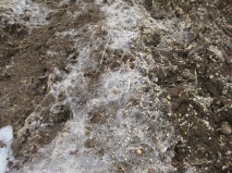 雪融けで見え始めた土を観察すると、有肥区と比較してその繁殖の状態は緩慢ですが蜘蛛の巣状の菌の繁殖が見られました。